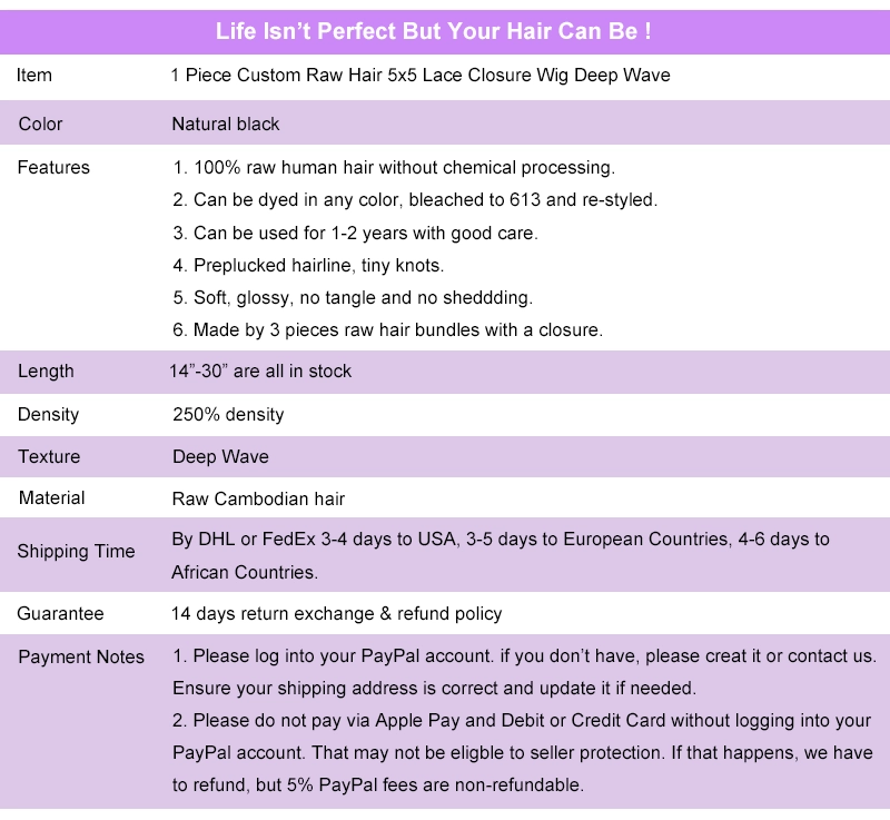 1 Piece Custom Raw Hair 5x5 Lace Closure Wig Deep Wave